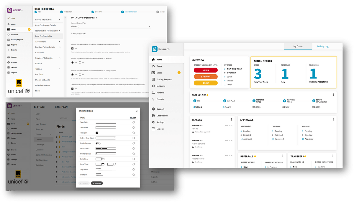 The CPIMS+/Primero provides intuitive digital forms and clear workflows to assist with documenting case management processes, from identification and registration, to assessment, case planning, referrals and transfers, and case closure. The CPIMS+ represents an opportunity to strengthen case management with the use of information management technology reflecting SOPs, workflows and paper forms that partners are utilizing. The CPIMS+ is highly configurable so that it can be adapted to different types of programmes. The software is supports internationalization and is available in English, French, Arabic, Spanish and more!